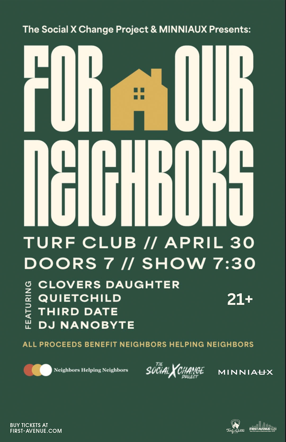 This event is a community-led benefit concert organized by The Social X Change Project in partnership with MINNIAUX, with Neighbors Helping Neighbors as the benefiting organization.