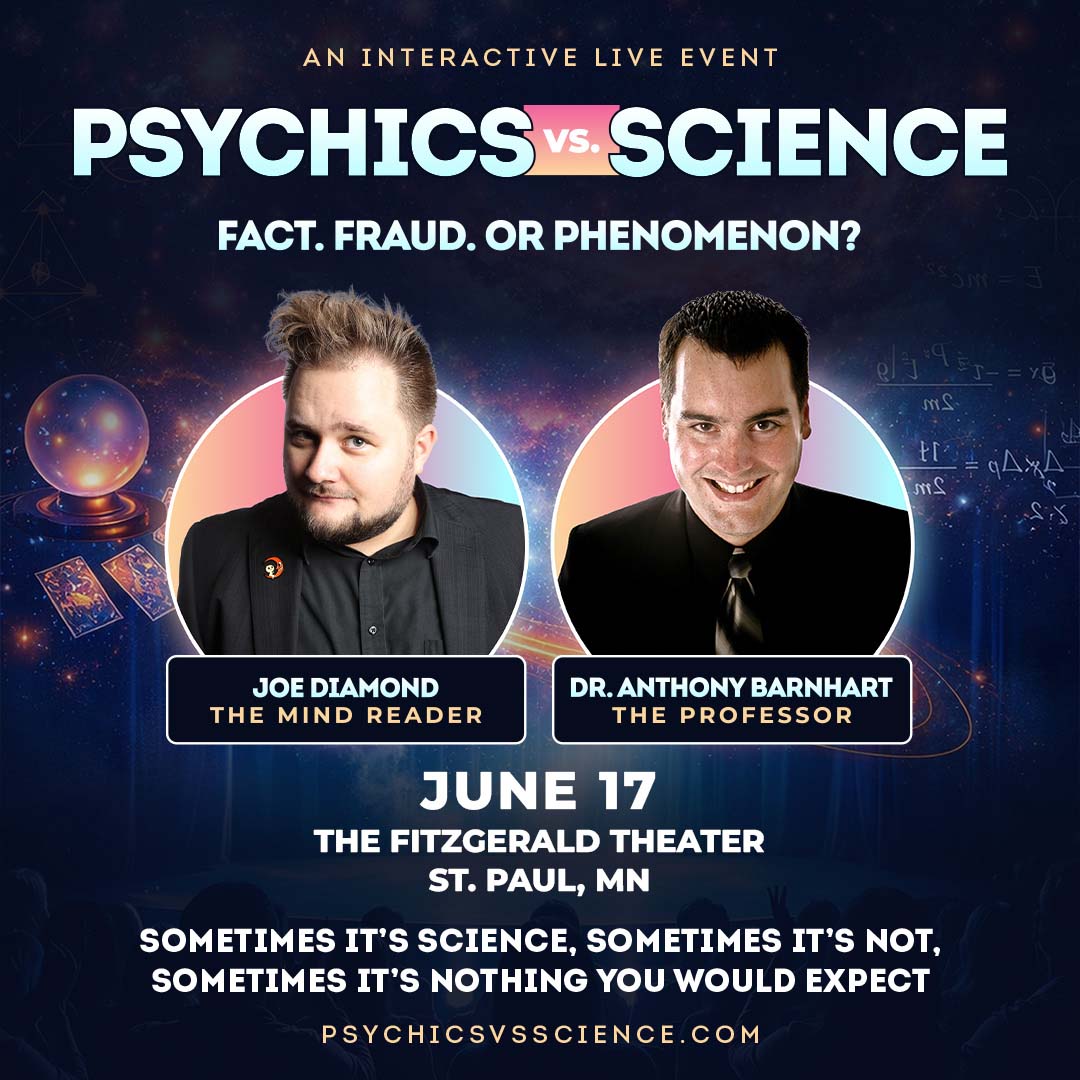 Fact, fraud, or phenomenon? A psychic and a scientist share the same stage to put those questions to the test in Psychics vs. Science (www.psychicsvscience.com), a high-energy, interactive live event featuring “America’s Greatest Mind Reader” and world record holder Joe Diamond (The Mind Reader) battling cognitive scientist and Carthage College professor Dr. Anthony Barnhart (The Professor) for an unpredictable night that challenges what audiences think they know about the human mind. Audience participation is highly encouraged, Joe Diamond will dazzle and Dr. Barnhart will question. Believer or Skeptic we predict you will have a great time!