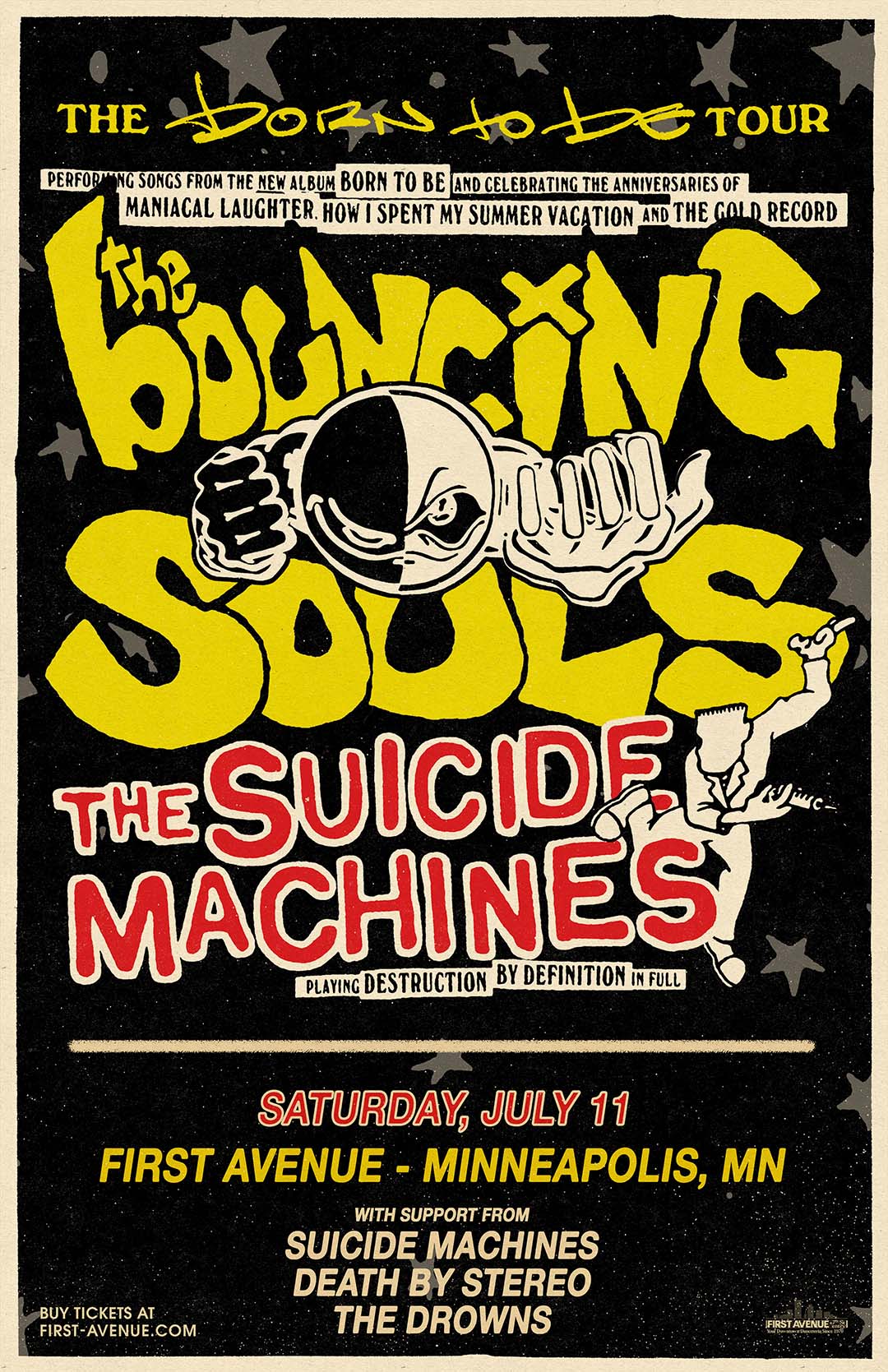 The Bouncing Souls performing songs from the new album Born To Be and celebrating the anniversaries of Maniacal Laughter, How I Spent My Summer Vacation, and The Gold Record. Along with THE SUICIDE MACHINES, performing Destruction by Definition.
