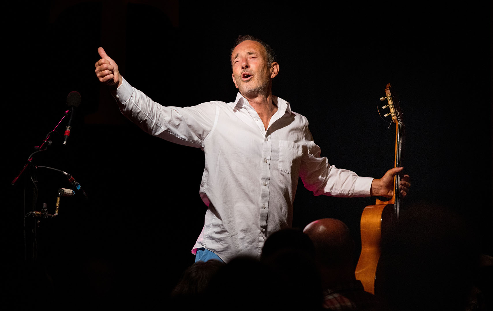 “The music we're doing now works well in quiet places like theaters and performing art centers. We still don't use a program or a set list so we don't know what we'll do until we do it. Please do not expect old songs. Many singers my age do a retrospective; this show is not like that. It's mostly stuff made up in the last 3 and 4 years. Some of the songs presented might be in different languages; this is not to be esoteric or clever, it's because the different languages help me express different feelings sometimes. One last thing, my idea of a good show has nothing to do with applause. It's about if all the songs I sang that night were ones that I felt.”